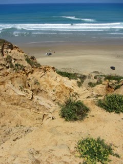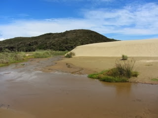 Duny se tady rozkládají na územý asi 7km čtverečných a jsou vysoké 100m a víc, takže žádní drobečci. Provozuje se tady sand boarding. Celková scenérie a nečekaná podívaná nás úplně pohltila. Využili jsme toho, že máme skvělý vůz s pohonem všech čtyř kol a dojeli řekou až na pobřeží. Tam se lámaly veliké vlny a vůbec to tam bylo velmi divoké. Uvařili jsme si špagety z plechovky (veliký fujtajksl) a vyrazili přenocovat na parkoviště u hlavní silnice.