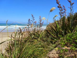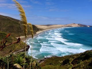 Potom jsme navštívili další zátoku s kempem a pláží Spirits Bay. Odpoledne jsme vyrazili na západní pobřeží na místo, na kterém jsou obří pískové duny. Bylo to vážně působivé, jako poušť, jen tam byla řeka, okolo zelený les a na konci oceán, v dálce pastviny plné ovcí a krav. Opravdu velmi zvláštní a krásné místo.