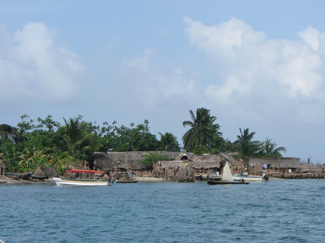 Jižně od Porveniru byly dva ostrůvky s prvními vesnicemi. Doslova přetékaly chýšemi. Podle průvodce vesnice poměrně turisticky orientované, protože jsou nejblíž celnici. Obepluli jsme útes a zakotvili u vesnice na ostrůvku Wichubwala. Hned jsme se vydali na ostrůvek v očekávání, jak to tam bude vypadat. Koukali jsme jako puci. Ještě než jsme vyrazili už u nás byla první kánoe s třemi ženami a jestli si chceme koupit mola. No a co to je mola? Ptala se Pája jediné z nich mluvící Španělsky ... a ony vytáhly takovou nedbale sešitou dečku, Pája nechápavě koukala, no co to je a na co to je. Nepochopili jsme to byly to nedbale sešité čtverce látky s vyšitými vzory místních zvířat, indiánskými ornamenty atd. Nakonec jsme si alespoň pro dobré vztahy koupili korálky na ruku. Nu a vyrazili jsme do vesnice.