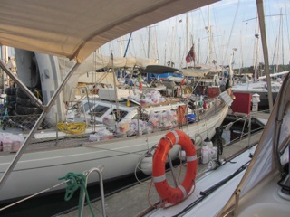 Odpoledne přijela obří jachta která je zajímavá tím, že má na zádi vzorně zabalený vrtulník. No ano, úplně normální vrtulník, jen je ve fusaku. A máme tady strašně zajímavé sousedy. Je to mladý Norský pár se 3 malými dětmi. Doma všechno prodali, koupili si loď a plují také kolem světa. Podobnou trasu jako my. Děti mají tak 5,3 a 1. To je ale frmol, ale zvládají to skvěle. Dneska udělali nákup na 8 měsíců. Molo mezi našimi loděmi bylo úplně plné igelitové tašky.
