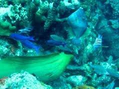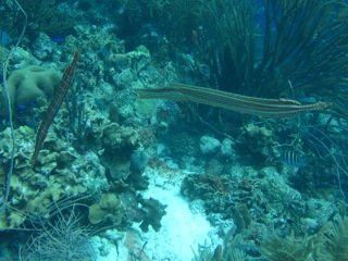 Jiná zajímavá ryba a velký predátor na útesu je ryba zvaná anglicky Trumpetfish [Aulostomus maculatus]. Dorůstají až 1m délky. A jsou také mistři maskování. Obvykle je najdete jak stojí verikálně mezi korály a dělají korál. Jsou to velmi úspěšní lovci. Když jdou lovit, tak často používají trik, aby se dostali blízko oběti. Plavou s větší rybou nebo v hejnu a dokonale se zbarví jako ona a splynou tak s ni. Když se chystají na útok, tak se napruží jako luk, pak vystřelí a otevřou velkou hubu a je to. Na fotce jsou tři takové, jak se skrývají v hejnu ryb s anglickým názvem Doctorfish [Acanthurus chirurgus].