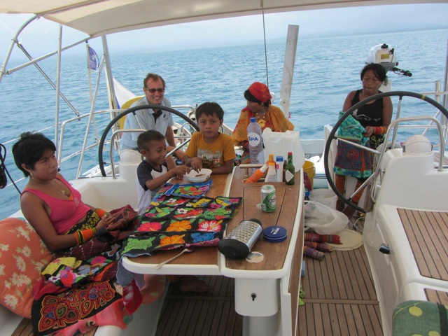 My jsme se během plavby z Curacao probíraly skvělým jachtařským průvodcem manželů Zyndlerových. Už předtím jsem se jinde dočetl o zajímavých ostrovech nedaleko průplavu a tak jsem se začetl do kapiloly o souostroví San Blas. Nemuseli jsme se vzájemně dlouho přesvědčovat, že se tady zastavíme. Takže jsme změnili kurz o 10 stupňů jižně a v pondělí v poledne jsme už proplouvali korálovou bariérou a mířili k ostrovu Porvenir, kde sídlí Kuny spravovaná imigration a maritima oficina. Zmapování této oblasti je jen přibližné, ale za pomoci již zmíněného Zyndlerovic pilota a našeho dopředného sonaru jsme úspěšně propluli mezi mělčinami a útesy a zakotvili kousek od přistávací dráhy malého letiště na Porveniru. Poučeni návštěvou Los Roques jsme zakotvili tak, abychom nevadili přistávajícím letadlům.