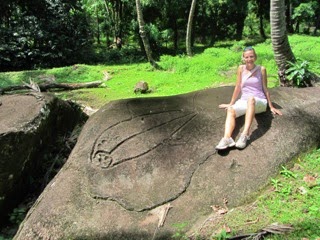 Pak jsme ale opustili Desire a Jacka a vydali se hledat do jungle ob?í petroglyfy. Ptali jsme se ve vesnici, ale vypadalo to, ?e to není jednoduché je najít. Místo toho jsme procházeli pohádkovou d?unglí, najedli se spadaných banán? a vid?li Moreea, to jsou takové plo?iny, kde se d?lali kdysi dávno slavnosti a ob?ady. Necht?li jsme se ale vzdát, vrátili se do vesnice a znovu se ptali, tentokrát u? jsme narazili na správného ?lov?ka, na Lionela. Ten nás posadil do auta a dovezl k p??ince, kterou jsme u? do?li a? ke skále s petroglyfy. Kolem Omoa jsou dv? místa a tohle bylo to blí? a jednodu?e dosa?itelné, to druhé nám bohu?el uniklo.