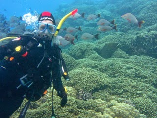 Včera bylo nádherně, bezvětří, hladina jako zrcadlo. Tak jsme toho využili a byli jsme se s Jonym potápět v Akváriu. Jony už nebyl pod vodou nějakou dobu, takže jsme si všechno zopakovali, ale viděli jsme při tom žraloka, Gain moray - opravdu velikou murénu, krásné korály a spoustu, spoustu barevných korálových rybek všude okolo. Když jsme si zopakovali základní potápěčské věci, tak jsme si zkusili driftovat jen se šnorchlem průlivem dovnitř zátoky. Proud tekl dovnitř, chytili jsme se za provaz od člunu a pak jsme frčeli jako na horské dráze .... Bylo to skvělé, takže jsme si to zopakovali pro změnu s lahvemi. Cestou jsme viděli žraloky, barakudy, velké trigger fishe. Sice jsme netrefili ten správný kaňon a vypluli jsme jinde, ale to vůbec nevadilo, dopluli jsme do akvária. Než Jonyho vezmu na opravdický ponor na venkovní útes, tak si dáme dva ponory spolu.