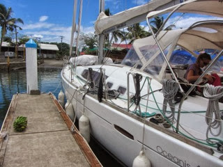 Vcera jsme hned rano slavne dopluli do Mariny Apia. Podle navodu jsme kontaktovali radiem Port control a ti nas nejprve odkazali na kotviste a pak, jeste nez jsme stacili zatovit poslali do Mariny. Podle informaci z pilota melo jit o zcela novou velmi hezkou marinu. Hned pri vjezdu bylo videt, ze polovina mariny je znicena a lode se tisni u jednoho nejzadnejsiho mola s plovoucimi pontony. Jsou tady orilivy uz kolem 1 metru.