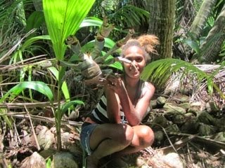 Nebo jina zvlastnost, pro prichoziho z Evropy rekneme neobvykla. Kdyz jsme predevcirem prisli k Sie na navstevu, zrovna se vecerelo, ani se neptala a uz jsme meli na taliri taro a rybu, stejne jako ostatni clenove rodiny. Ji se tady rukama a ruce se tady nemyji pred jidlem, ale po jidle, stejne jako na Samoa. No a pak jsme si povidali, jak ziji, co jedi jak to delaji s prasaty, ktera behaji vsude po vesnici a tak. Celou dobu okolo nas pobihala roztomila stenatka. Sia rika, no to jsou vsechno stenatka tehle fenky ... my je krmime a pak je snime, maji dobre maso ... Paja to vubec nepochopila, musel jsem ji to zopakovat trikrat a pak se jeste musela zeptat znovu a Sia ji bez mrknuti zopakovala, no ano, maji skvele maso. Takze tady se psi pestuji na maso spolecne s prasaty, to je co? Krome toho jedi ryby, taro, jamy, banany, chlebovnik, mango, papaju ... a to je zvolna skoro vsechno. Pripravuji umu (na zhavych kamenech), podobne jako jinde v Polynesii. Kdyz Sia dostala od jachtaru cocku, tak prohlasila, ze to je moc slozite a zdlouhave a na to nema cas ... no neni v tom logiky ani co by se za nehet veslo, kdybyste videli, jak pracne je pripravit taro. Spis se jedna o nejaky podvedomy odpor ke vsemu, co nejedi odjakziva a nemaji za domem na zahrade.