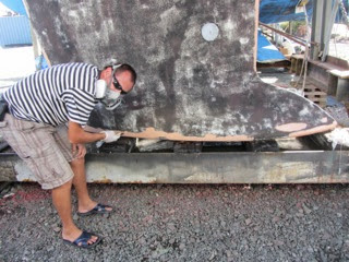 Perla, se zatím nerozlomila a je na souši a my zápasíme jednak s počasím, protože od pondělí nepřetržitě prší, druhak s tím, že tady je kde co zakázané a do třetice s tím, že jsme měli loď zarostlou barnekly, po kterých zbyly takové bílé zbytky a ty nejdou dostat dolů, takže nás bohužel čeká nejspíš pracné broušení celého spodku lodě.
