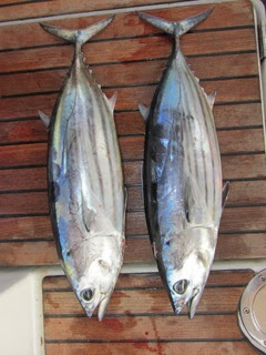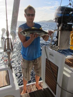Kluci mají splněnou tedy velkou rybu, měří 135cm, váhu nemáme, ale držet jsme ji museli oběma rukama. Vyfiletovali jsme ji, část hned snědli jako sashimi, část jako steaky, kus máme v lednici na zítra, polévka je ještě na sporáku a mrazák zase úplně plný. Myslíte, že to bylo všechno? Ne, ne, v průlivu do laguny nám ještě zabrala španělská makrela, tu vytáhl Sam sám a hned po příjezdu jsme ji dovezli rodině, co bydlí na břehu, byli rádi.
