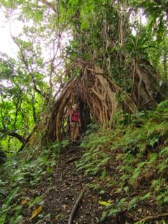 Po cestě bylo dusno, deštěm promáčená džungle, nyní zalitá sluncem a bez větru se snad celá najednou rozhodla odpařit. Na cestě bylo mnoho míst. kde jsme museli obcházet veliké kaluže a jezírka, která tam po lijáku zbyla. Jinde jsme narazili dokonce na sesuv půdy, kdy se ze stráně nad cestou sesunul celý banyán i spřilehlým porostem. Vonělo to tam intezivně zemí a mnoha různými vůněmi přelámaných stromů, kapradin a bylin. Obešli jsme sesuv a pokračovali jsme dál k odbočce na Yasur.