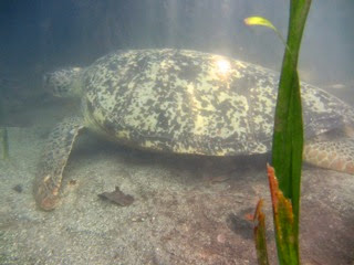 Vypadalo to jako zábava, tak jsme odložili odjezd a vydali se o hodinu později vybaveni foťáky a neoprénem na břeh a pak přes mělčiny směrem k mangovníkům, kde "preserv big turtul". S místními nikdy člověk neví, co může čekat, kulturní rozdíl je ohromný. Tedy dorazili jsme k mangovníkům, kde na nás čekal "men vu nouvs everyfink abaut turtl". Byla tam taková cestička v mangrovech zahrazená plotem. Vody asi po kolena a dno bahnité. Želva ležela u plůtku, byla ohromná. Tam jsme se dozvěděli, že ji chytili na útesu a zavřeli sem, aby ji mohli ukazovat turistům. Takže "preserv" znamenalo v této situaci věznit. No dobrá, už jsem to slíbil, nechali jsme si slíbit, že ji alespoň do roka pustí zase na svobodu a nesnědí. Pokusil jsem se udělat několik fotek pod vodou, ale bylo to díky minimální viditelnosti téměř nemožné. Pak nám ukázali, jak ji chytit za krunýř. Další půl hodinu jsme s nimi diskutovali, že krmit ji tarem, papájou a zbytky jídla z vesnice asi nebude ideální a slíbili, že fotky pošleme mailem lidem v Port Vila.