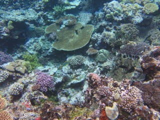 Když už jsme neodjeli, tak jsme se šli podívat na útesy kousek od naší lodě. Bylo tam hodně mrtvého útesu, nemnoho ryb, ale i kusy již pomalu se zotavujícího útesu, zatím s malou diverzitou druhů, ale alespoň něco. Už jsem psal minule, že zkázu kilometrů a kilometrů zdejších korálových útesů na svědomí hvězdice "trnová koruna", která se živí korály, a ta se přemnoží tam, kde lidi vyjedí zévu a pozabíjí pyskouny obrovské.