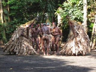 Pak jsme se odebrali na "náves", kde jsme byli představeni náčelníkům a ti se potom odebrali připravit se na tanec. Zatím, co jsme čekali, tak jsme pozorovali dění okolo. Asi za půl hodiny bylo všechno připraveno a John nás pozval na místo, kde se odehrávají ceremoniály, rituály a také Rom Dance. Tanec Rom se tančí, když se pořádá ceremoniál, kdy se muž posouvá výš v hierarchii vesnice, nebo při obřízce, nebo, když se kupují práva na vyřezávání tamtamů s soch. Při těchto ceremoniálech je zabije rodina, či žadatel nebo uchazeč dohodnuté množství prasat. Pak v nakamalu až několik dní jí, pijí kawu, tančí. Když je vše dohodnuto, tak poslední den muži tančí ve velmi zvláštních maskách, pomalováni barvami a oděni do banánových listů. Masky představují jednotlivé duchy předků a po skutečném obřadu jsou spáleny, aby duchové neobtěžovali ve vesnici. My jsme viděli turistickou, zkrácenou verzi jednoho z Rom tanců a myslím, že celkově si "hoši" z Fanla měli dát za vysokou zaplacenou cenu víc záležet. Ale i tak to byl zážitek.