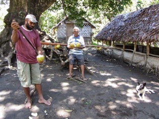 Mezi naším kotvištěm a Ranvetlamem leží veliká kokosová plantáž. Tuhle plantáž vybudovali běloši a když se Vanuatu osamostatnilo, tak půda vrátila původním majitelům, tedy rodině Harryho a jeho bratrů. Jedním z bratrů byl jakýsi James a ten má syna Johna. Tenhle John jednou byl dole na pláži, když jsme se chystali odjet. Pozdravili jsme se a on se představil, jako vlastník téhle pláže a celé plantáže. A pak nás vzal nahoru a natrhali nám tam čerstvé citróny, hned asi tři různé druhy a jack's fruit, česky mimozemšťana.